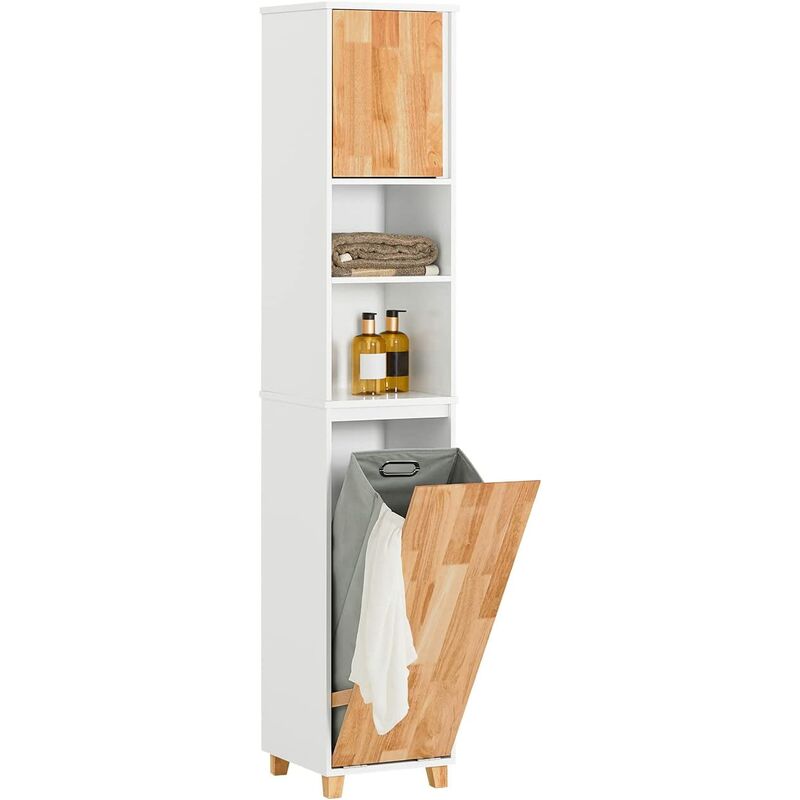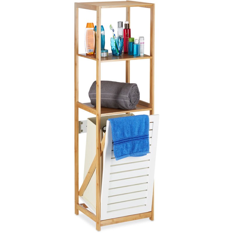 Colonne pour salle de bain avec panier à linge basculant et 3 etagères de rangement meuble en bambou et toile d'oxford