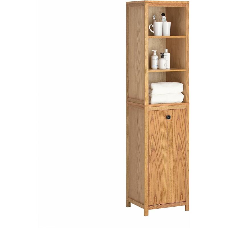 COSTWAY Meuble Colonne Salle de Bain, Armoire de Rangement Étroite avec Panier à Linge, 2 Compartiments Ouverts, Porte Rabattable, Dispositif