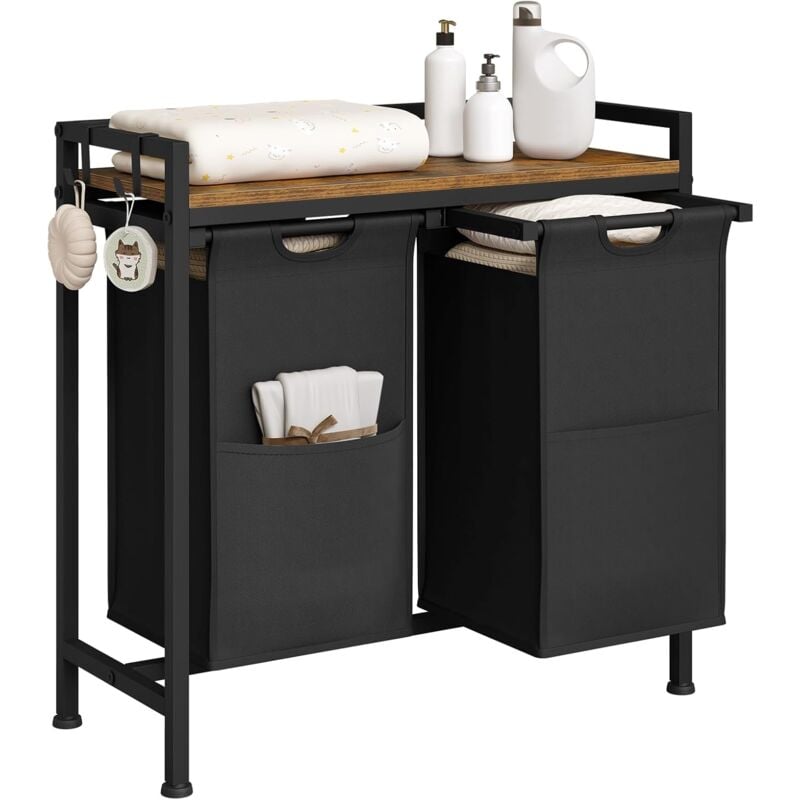 Panier à Linge 2 Compartiments Woltu Meuble Panier à Linge,avec Étagère, Sac à Linge en Tissu Oxford Amovible, Cadre en Métal, Marron Rustique+Noir