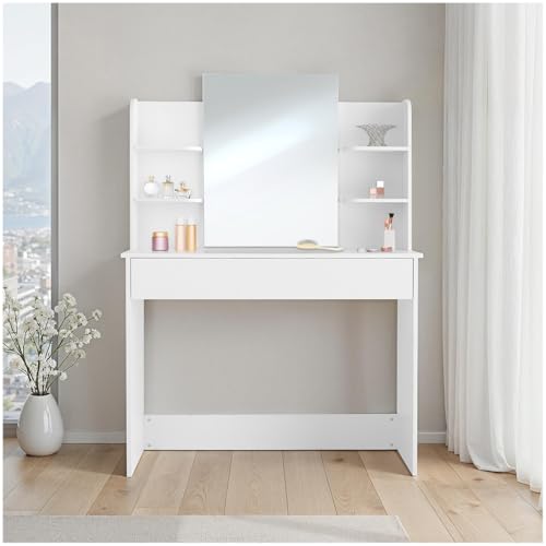 tectake® Coiffeuse 100 x 40 x 139,5 cm, Miroir 49 x 64 cm, Large Tiroir avec 3 compartiments, 4 Étagères, Coiffeuse avec miroir, Table de maquillage Meuble chambre adulte Deco chambre ado fille, Blanc