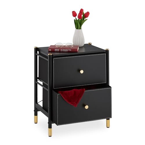 Relaxdays Table de Nuit, 2 tiroirs, HxLxP : 55,5 x 46 x 33 cm, Meuble Chevet, Petite Commode, Chambre, Salon, Noir/doré