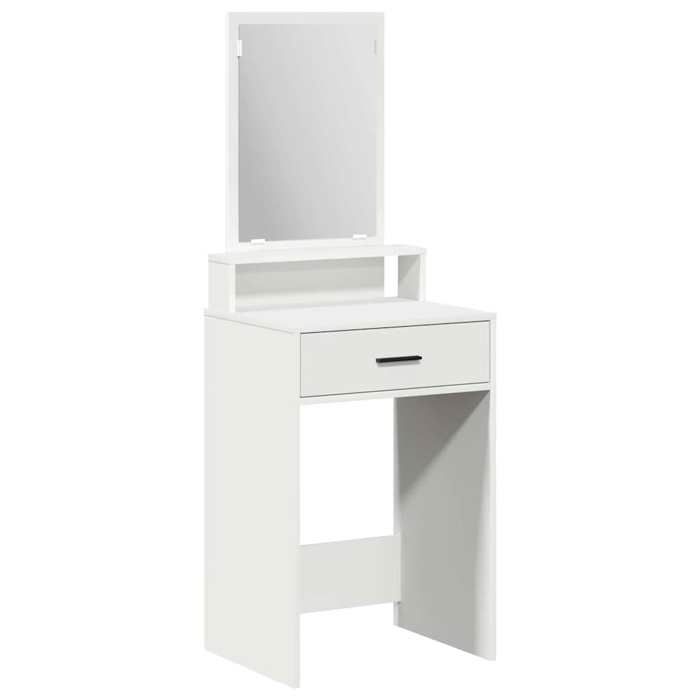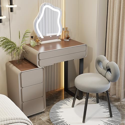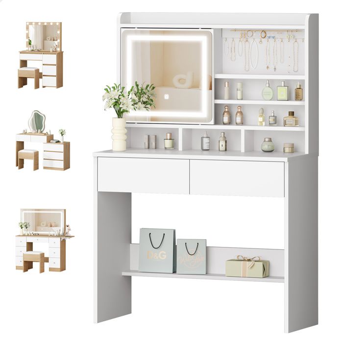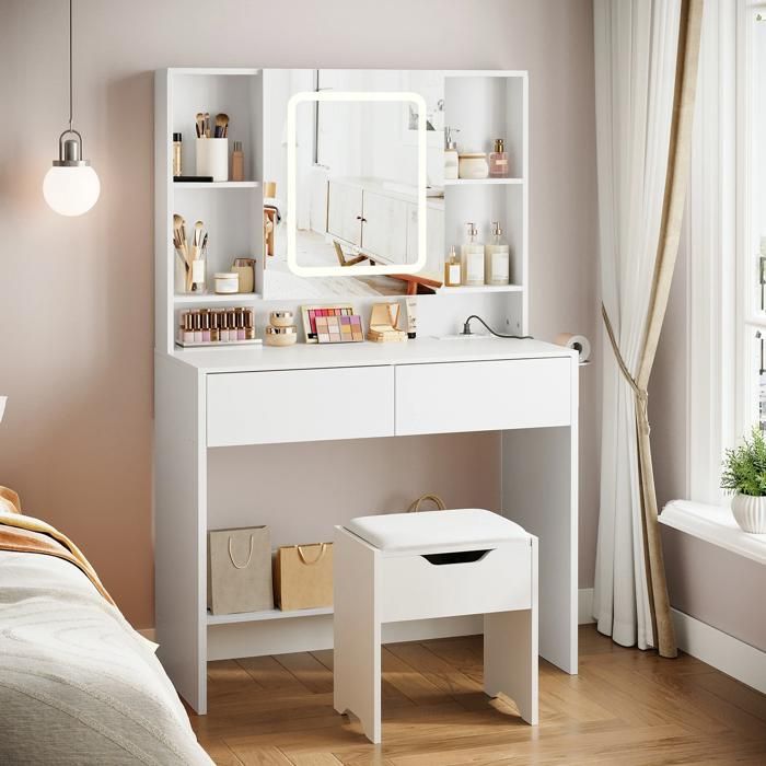 Coiffeuse blanche avec miroir led, tabouret et 3 tiroirs, design moderne, meuble de chambre pratique