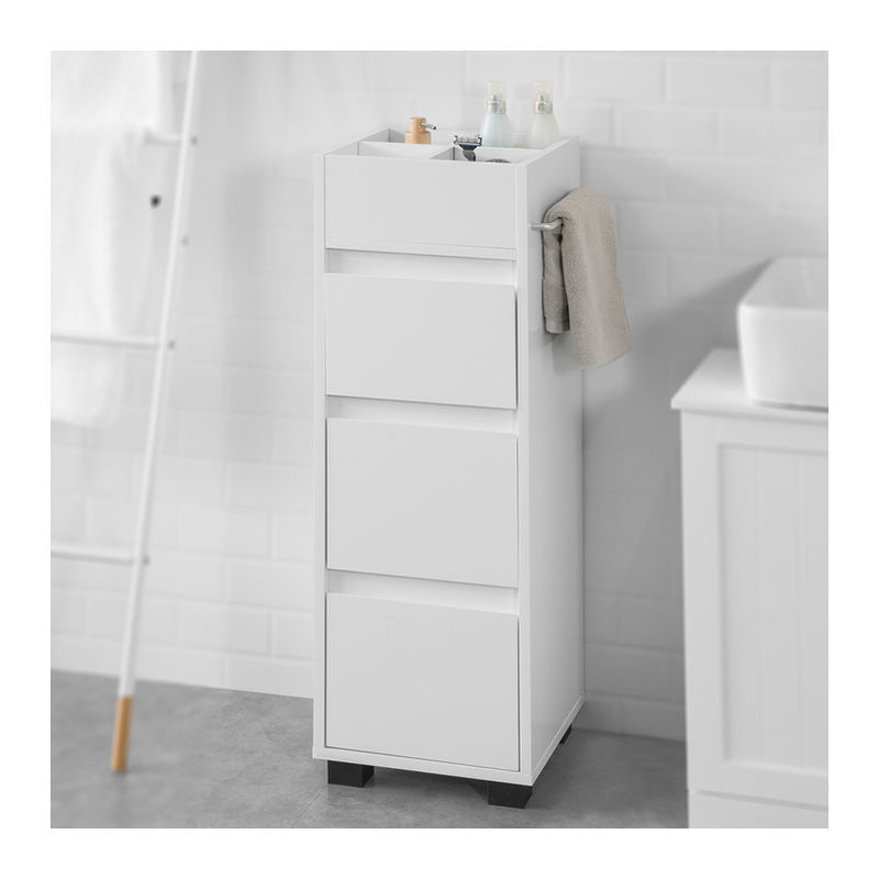 Sobuy - Meuble Colonne – 30×30×90 cm, 3 Tiroirs + 4 Niches + Porte‑Serviettes Réglable, mdf Laqué Blanc Mat, Style Moderne Gain de Place