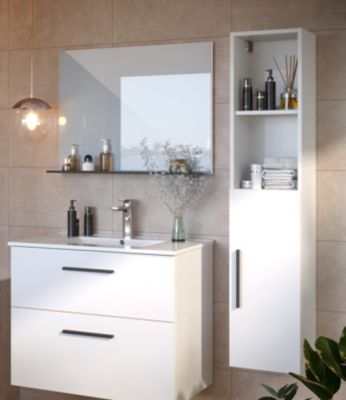 Vente Unique Meuble de salle de bain suspendu simple vasque avec colonne de rangement Coloris blanc 80 cm KAYLA