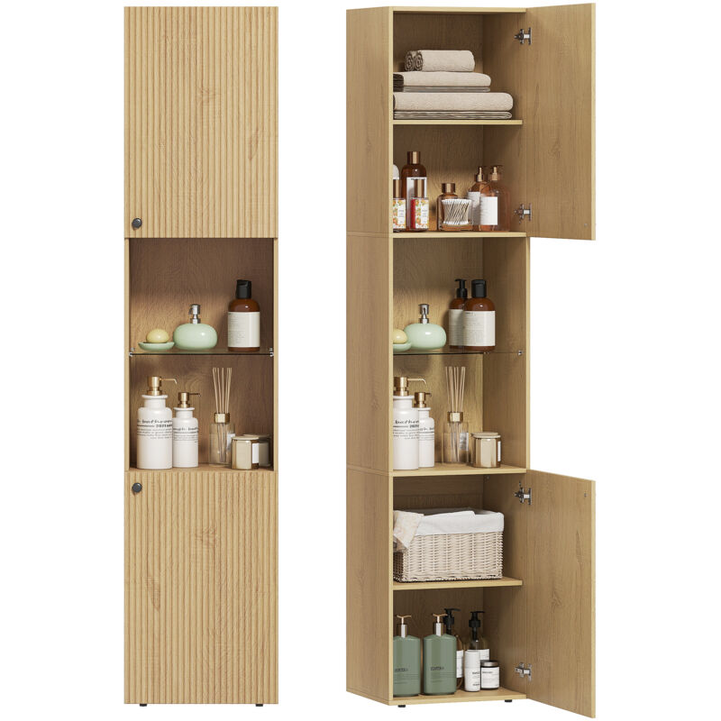 Armoire salle de bain haute, meuble de rangement colonne 6 niveaux 2 portes et étagères réglables, 40x31x182cm, chêne-Chêne
