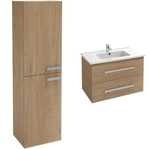 Jacob Delafon, Meuble Colonne Ola UP 40cm, Grande Capacité, Porte Réversible, Poignées Métal + Meuble Ola UP 80cm, Plan Simple Vasque Céramique, 2 Tiroirs Fermeture Douce, Chêne Colorado