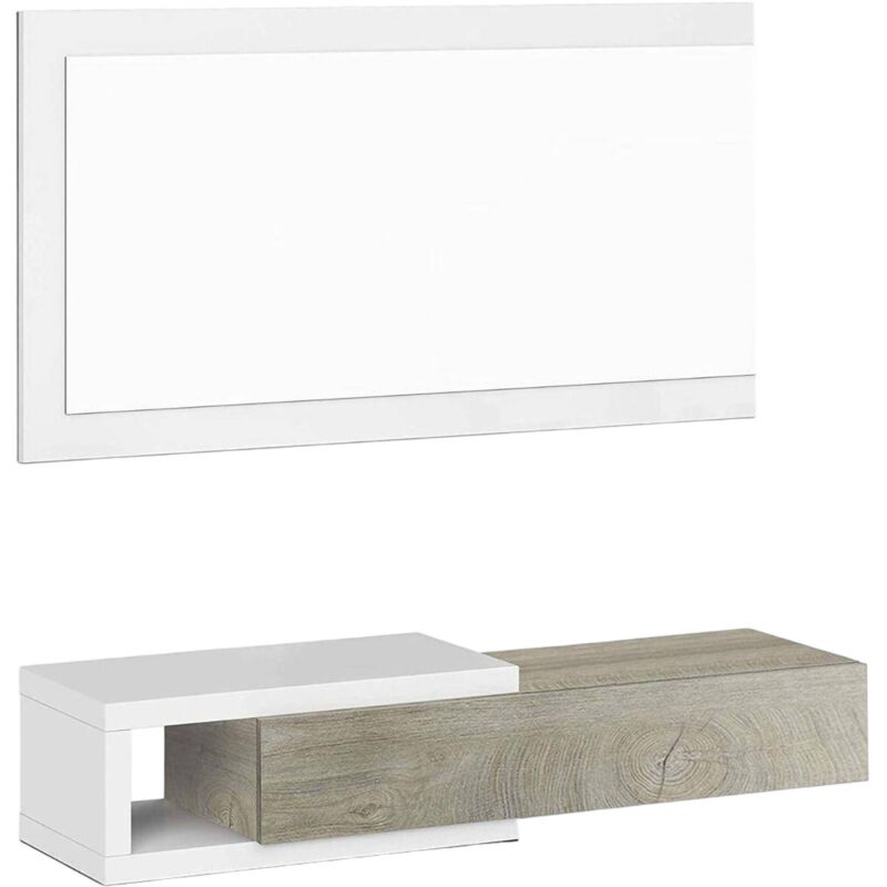 Mobimarket – Meuble d'entrée moderne avec miroir vertical – Dimensions 75 x 29 x 20 cm – Finition blanc artik et chêne canadien – Tiroir pratique