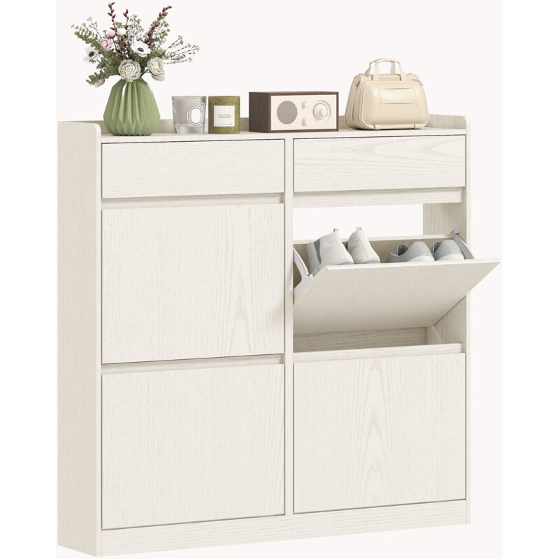 Armoire à Chaussures Étroite avec 4 Tiroirs Basculants et 2 Tiroirs Coulissants, Rangement pour 8 Paires, Meuble d'Entrée en Bois, Blanc,