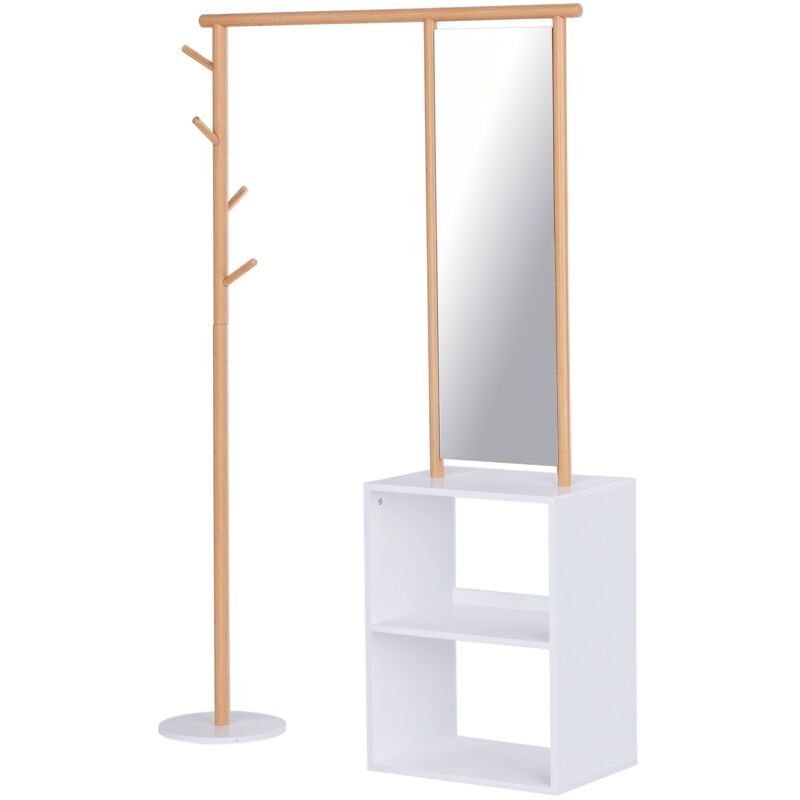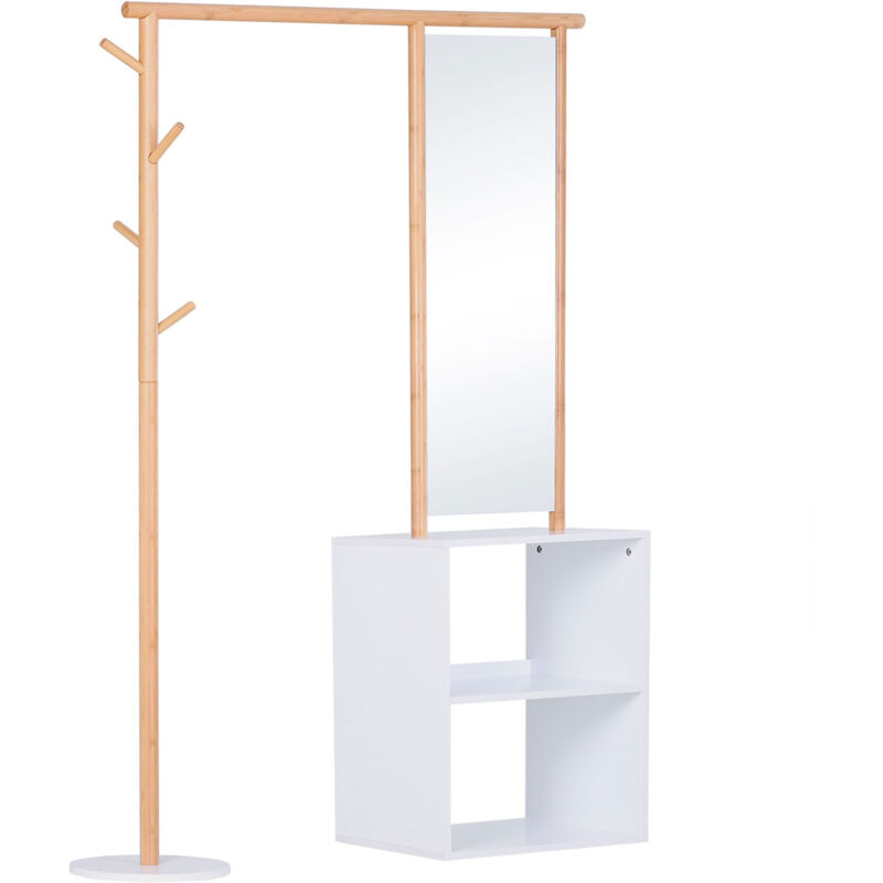 HOMCOM Porte-manteaux meuble d'entrée vestiaire penderie avec miroir 4 patères 2 niches dim. 100L x 34l x 164H cm MDF blanc bois massif bambou-Blanc