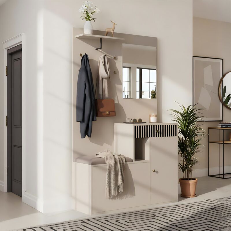 Urban Meuble - Vestiaire d'entrée effet bois et blanc combiné avec miroir, 2 tiroirs, 2 portes et banc d'assise