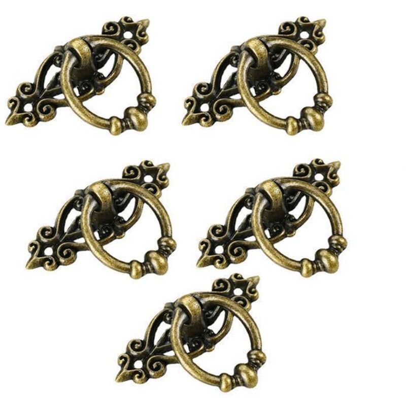 Lot de 5 poignées vintage pour porte de tiroir, placard ou meuble, en fer doré et laiton antique.