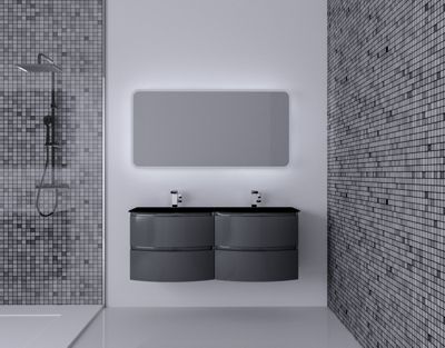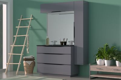 Meuble vasque à poser gris anthracite brillant l.120 cm + plan double vasque noir en résine, Pamili