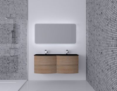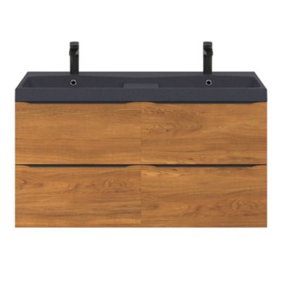 Meuble vasque suspendu effet chêne l.120 cm Imandra + plan double vasque noir résine Mila, GoodHome