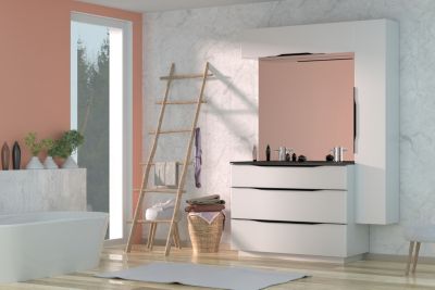 Meuble vasque à poser blanc mat l.120 cm + plan double vasque noir en résine, Pamili