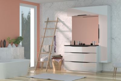 Meuble vasque à poser blanc brillant l.120 cm + plan double vasque noir en résine, Pamili