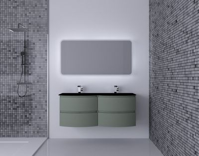 Ensemble Vague L.138 cm meuble sous vasque à suspendre kaki mat + plan double vasque verre noir mat