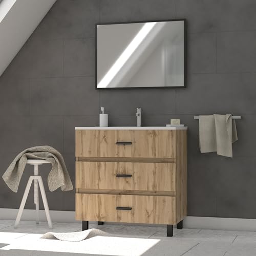 AURLANE Ensemble Meuble de Salle de Bain - Chene Industriel - tiroirs -Pieds en Aluminium Noir Mat - Miroir