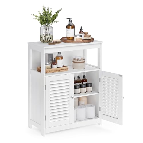 Bealife Meuble WC, Étagère de Toilettes sur Pied, Meuble Toilette avec 2 Portes, Étagères Réglables et Compartiments Ouverts, Blanc