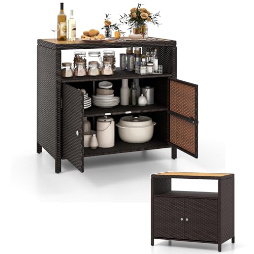 KOMFOTTEU Armoire d’Extérieur en Rotin, Buffet Extérieur & Intétieur avec Plan de Travail en Bois d'acacia, Meuble de Rangement de Jardin avec avec Étagère Ouverte, 90 x 53 x 86 cm (Marron)