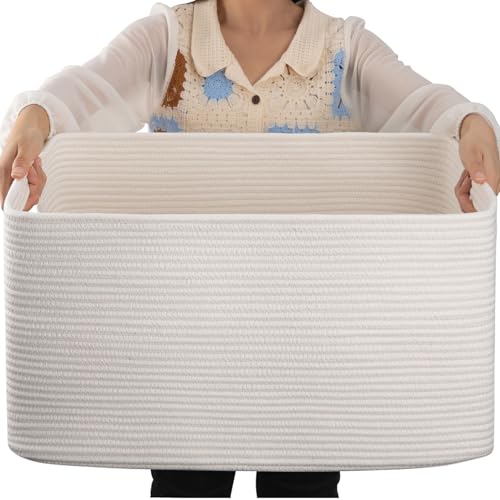 OIAHOMY Grand panier en corde de coton avec poignée – Panier de rangement tissé pour couvertures, jouets, salon et chambre d'enfant – 75 l – Blanc
