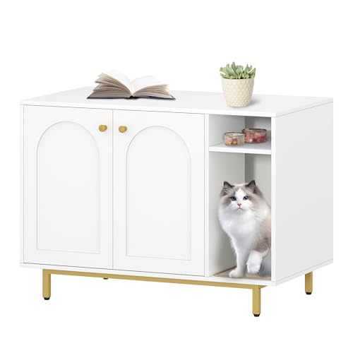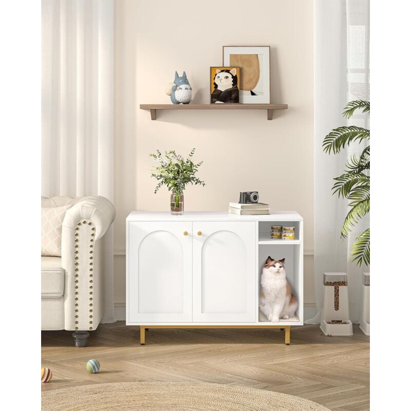 Hzuaneri Maison de Toilette Chat, Meuble Litiere Chat, Meubles Cachés, Maison pour Chats avec Porte et Cloison Séparée, Table d'appoint en Bois Domestique, 100 x 50 x 72 cm, Blanc et Or CB86903A