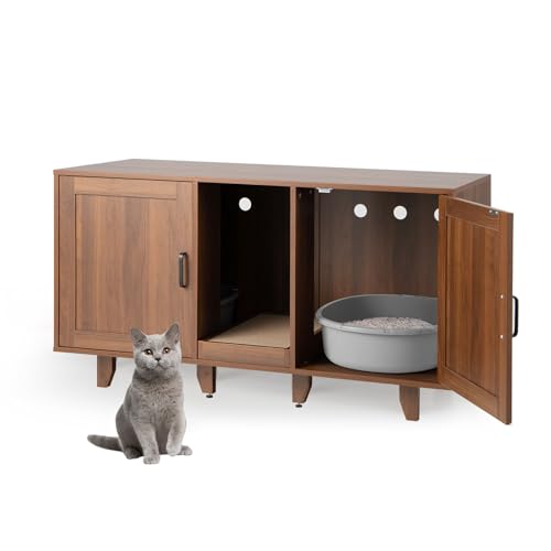 SOARS Maison de Toilette Chat avec 2 Portes, 120 x 52 x 65 cm, Meuble Litiere pour Chat en Bois avec Entrée Centrale et Griffoir, Armoire pour Chats pour Salon, Chambre et Entrée (Marron Bois)
