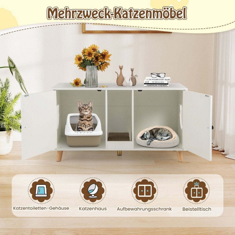 GOPLUS Maison de Toilette pour Chat 3 en 1, 52 x 120 x 65 CM, Meuble Litiere pour Chat à 2 Porte avec Pieds Amovibles et Planche à Griffer Détachable, Trou de Ventilation, Idéal pour Intérieur, Salon