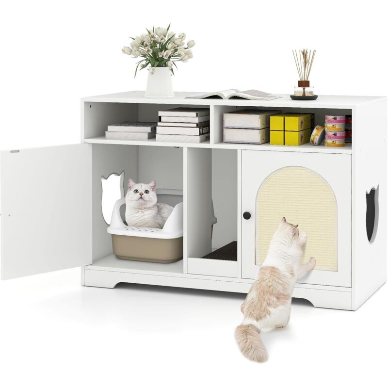 4 in 1 Meuble Litiere Chat, Cache Litiere Chat Double Portes, 2 Compartiments, Planche et 2 Tapis à Griffer en Sisal, 2 Trous Latéraux, Blanc