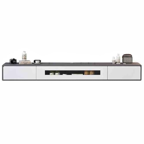 RQLSSSLMXJ Meuble TV Suspendu en Bois Massif, Meuble TV Mural Minimaliste avec tiroir et Porte abattante, Console multimédia (Gris + Blanc, 220 x 20 x 24 cm)