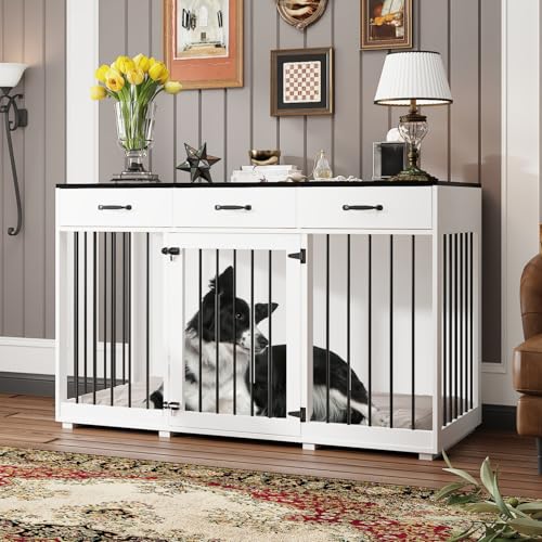 DAWNYIELD Cage pour Chien, Caisse pour Animaux de Style Meuble avec Portes Coulissantes, Niche D'intérieur en Bois avec tiroir, Maison pour Chien avec Gamelle Pivotante à 360°, Blanc