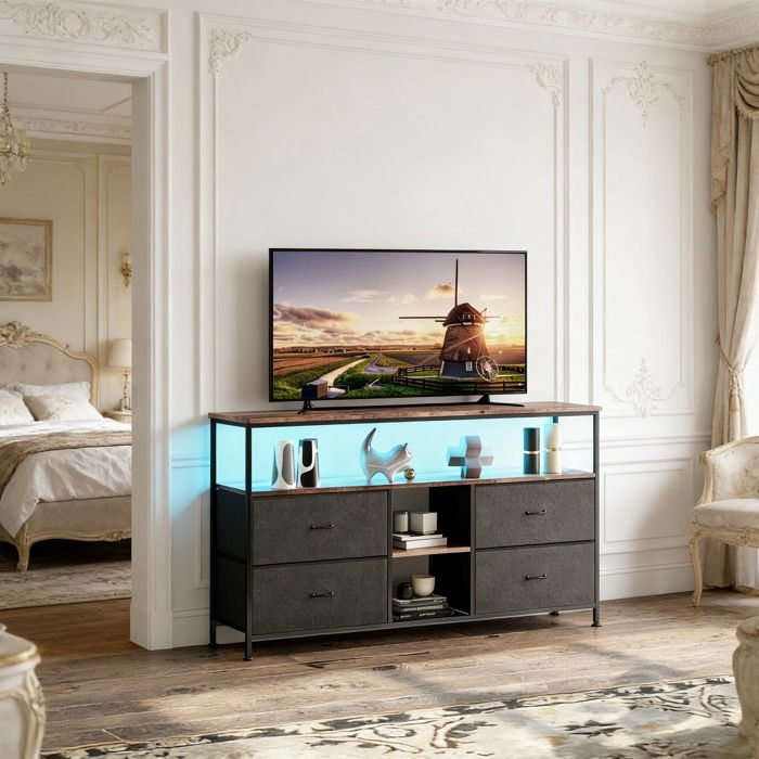 Meuble TV - 180 cm - Éclairage LED 16 couleurs - Rangement optimisé - Design industriel noir et bois