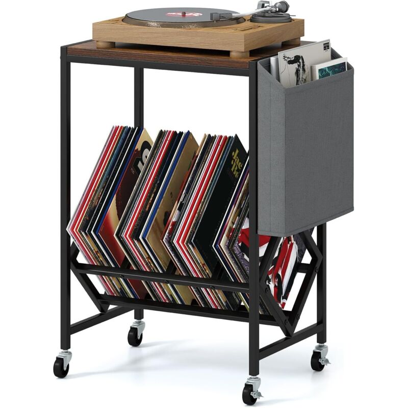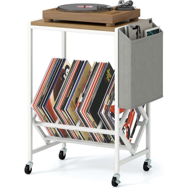 COSTWAY Meuble Platine Vinyle a Roulette, Petit Support pour Tourne-Disques avec Poche, pour 200 Albums Disques CDs, Cadre en Métal, Meuble Rangement