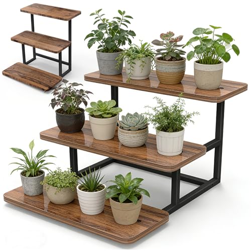 IDUNSEED Support Plante en Métal Bois, 3 Étagen Meuble Porte Plante pour Plusieurs Plantes, Support Pot de Fleur le Balcon du Jardin, Salon, Bureau, Intérieure, Extérieur