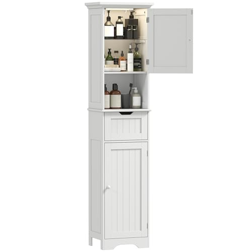 HOMCOM Meuble Colonne Salle de Bain avec éclairage LED, Meuble de Rangement étroit avec tiroir, 2 Portes, Compartiment Ouvert et étagère réglable, pour Toilette, Petits espaces, 40x30x170cm, Blanc