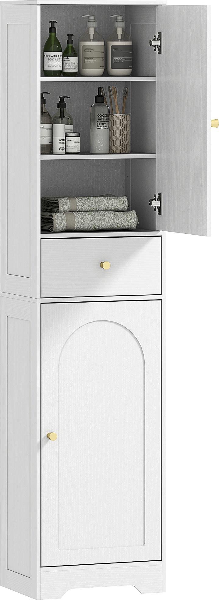 kleankin Armoire salle de bain haute, meuble de rangement colonne, placards, tiroir, étagères réglables, niches ouvertes, grand meuble étroit pour toilette, petits espaces, 30x30x180cm, blanc brillant