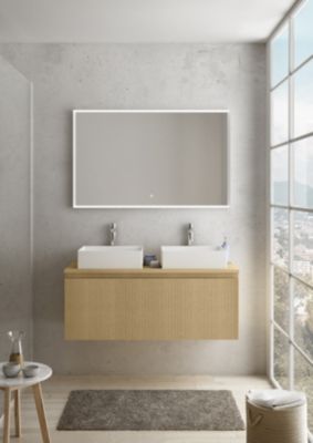 Meuble vasque suspendu plaqué chêne miel strié l.120 cm + plan de toilette plaqué chêne miel pour 2 vasques, Pura+