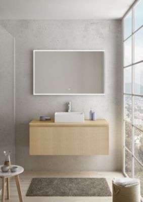 Meuble vasque suspendu plaqué chêne miel strié l.120 cm + plan de toilette plaqué chêne miel pour 1 vasque, Pura+