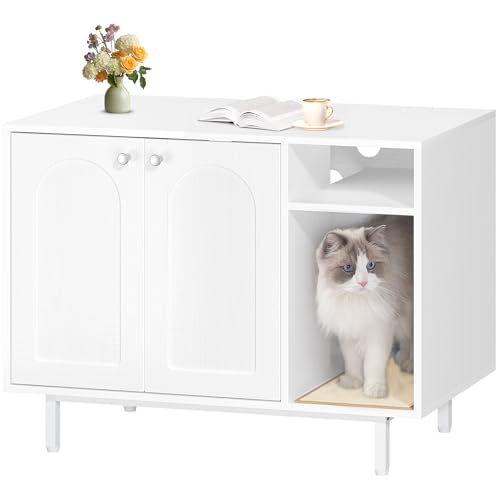 Garvee Meuble Toilette pour Chat en Bois avec Porte Coulissante, Étagère De Rangement Et Plateau Supérieur, Cache-Bac à Litière, Adapté à La Plupart des Bacs à Litière, Blanc