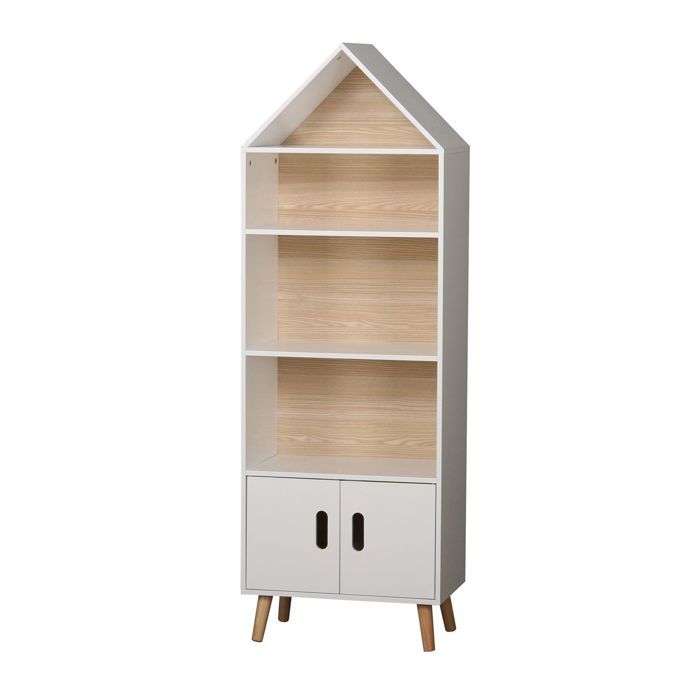 Meuble de rangement Bibliothèque Enfant Forme Maison 4 Etagères et 2 Portes 50 x 30 x H.142 cm
