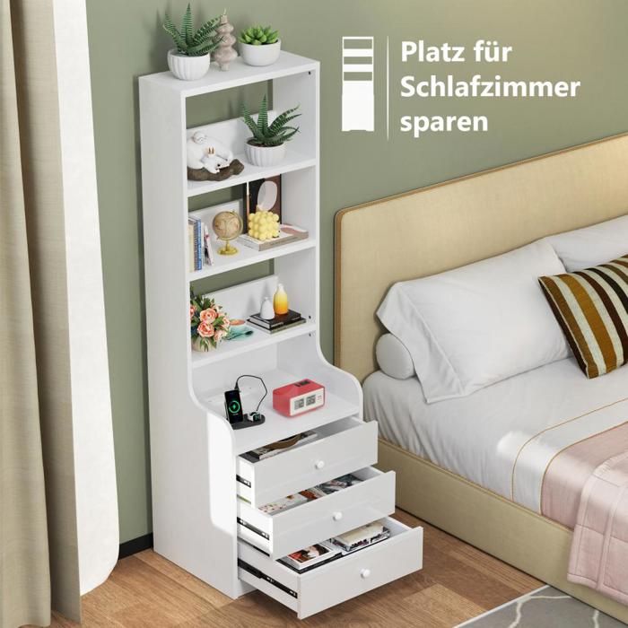 SUPFINE Table de Chevet Haute avec Station de Charge Table de Nuit avec Étagères Meuble de Rangement Bibliothèque pour Chambre