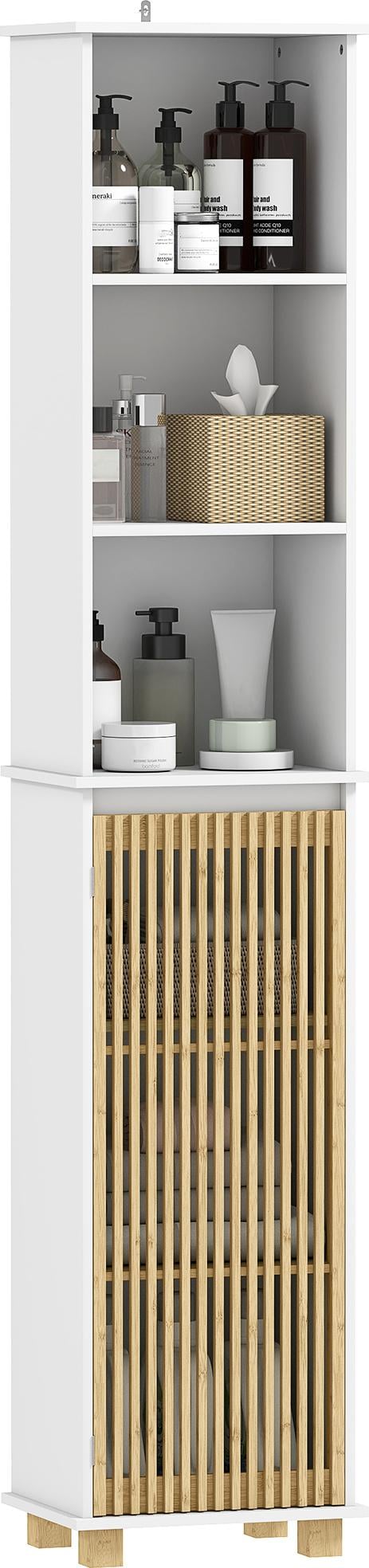 HOMCOM Colonne salle de bain, meuble salle de bain rangement, meuble de rangement avec porte à lattes en bambou et compartiments ouverts, armoire haute pour salon, cuisine - 35 x 26 x 173 cm, blanc