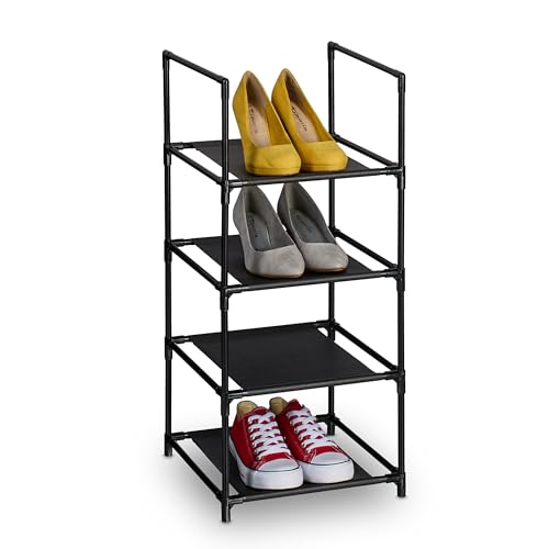 Relaxdays Rangement à Chaussures, 4 Niveaux, HxLxP : 72x33x33 cm, Meuble métal & Niveaux en Tissu, étroit, Noir - Gris