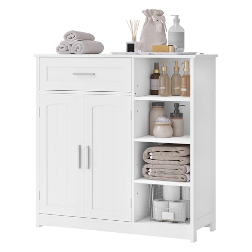 EUGAD Meuble Salle de Bain Rangement, Buffet de Cuisine, avec 2 Portes, 1 Tiroir, 4 Étagères Ouvertes Réglables en Hauteur, 80x30x80,5cm, Blanc