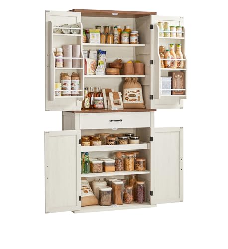VASAGLE Buffet Haut Cuisine, Meuble de Rangement, Armoire, Vaisselier, Hauteur 178,6 cm, avec Tiroir, Placards, Étagères Réglables, pour Salon, Cuisine, Blanc Rustique BBK364W02