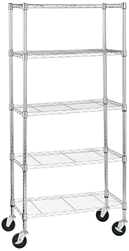 Amazon Basics Meuble de rangement moyen à 5 tablettes étroites sur roulettes avec étagères réglables en hauteur et pieds de nivellement, poids maximum de 680 kg, chromé, 35.6 x 76.2 x 164.5 cm