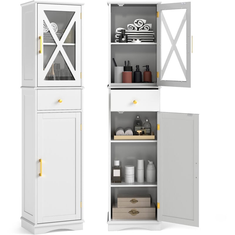 Armoire de Salle de Bain Haute, Meuble de Rangement Étroit avec Tiroir, 2 Portes et 3 Étagères Réglables, Tour à Linge Mince pour Cuisine, Salon,Blanc