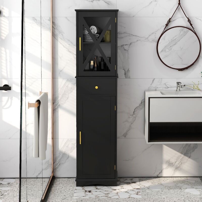 Armoire de Salle de Bain Haute, Meuble de Rangement Étroit avec Tiroir, 2 Portes et 3 Étagères Réglables, Tour à Linge Mince pour Cuisine, Salon, Noir