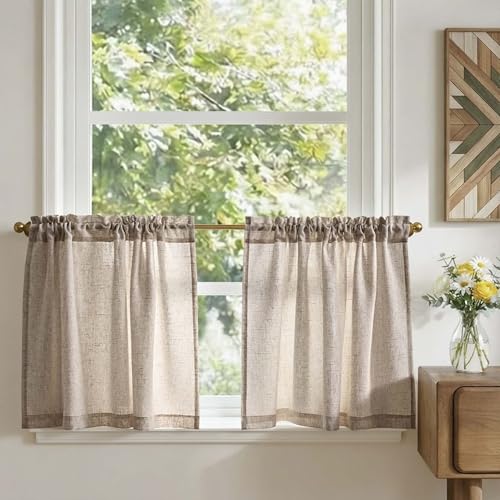 TOPICK Rideau Cuisine Petit Rideaux Court Brise Bise, Taupe 65L x 60H(cm) 2 Panneaux à Passe Tringle, pour Fenêtre Placard Meuble Bas Chambre Cache sous Evier,en Effet Légers Style Moderne