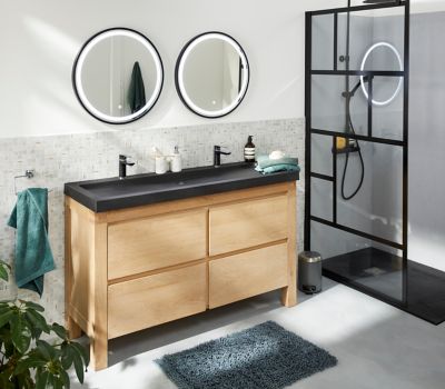 Meuble sous vasque à poser chêne massif et plaqué chêne l.140 cm + plan vasque en quartz composite noir, Cooke & Lewis Harmon