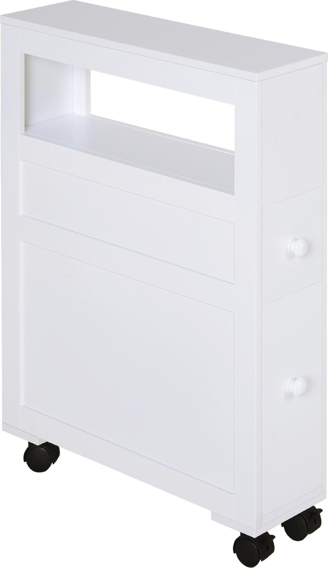 HOMCOM Meuble de rangement de salle de bain sur roulette, armoire WC toilettes étroit, avec étagère ouverte et 2 tiroirs, charge 20 kg, 16 x 52 x 71,5 cm, blanc